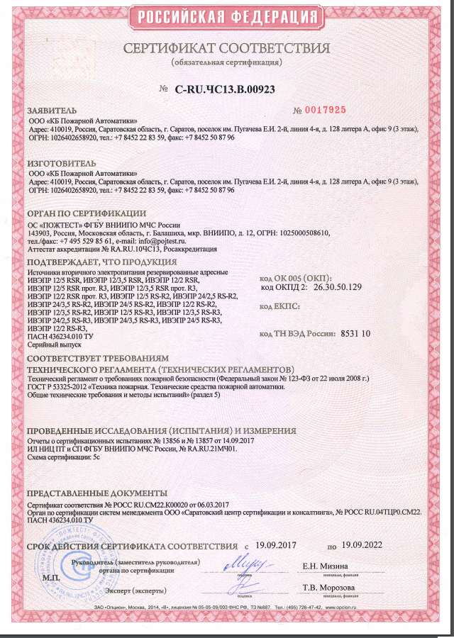 Источник питания номинальным постоянным напряжением 24 В и выходным током до 2,5 А. Предназначен для стабильного бесперебойного электропитания систем охранной и пожарной сигнализации, пожаротушения,