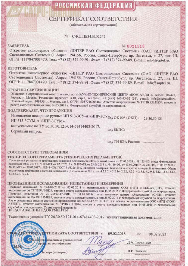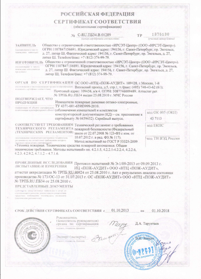 Предназначен для обнаружения загораний, сопровождающихся появлением дыма в закрытых помещениях зданий и сооружений различного назначения. При возникновении дыма в зоне расположения извещателя он формирует электрический сигнал о возникшем пожаре, регистрируемый приемно-контрольным прибором.