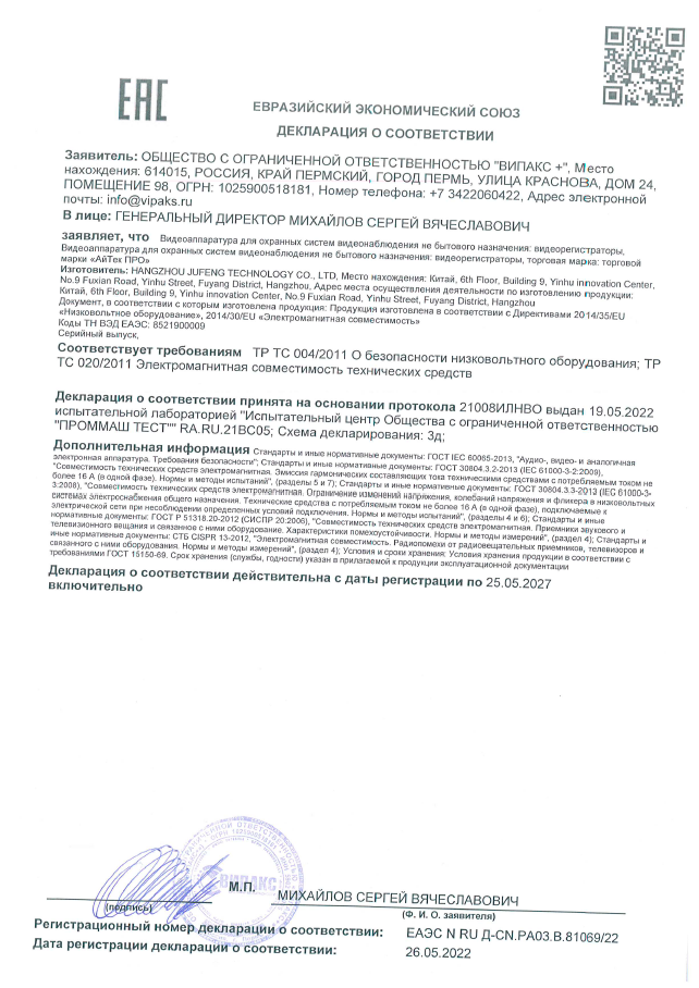 • Стандарт видеосжатия AHD / TVI / CVI / XVI / IP